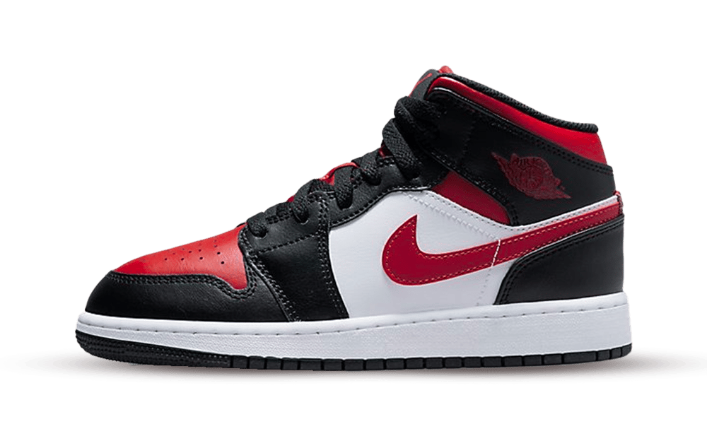 The Air Jordan 1 Mid Alternate Bred Toe features a white leather base with black leather overlays on the mudguard, heel and eyelets. Matching laces accentuate the colorful tongue. Several red leather inserts adorn the collar, side swoosh and toebox. A white sole with a black outsole finalizes the original look of the midtop.