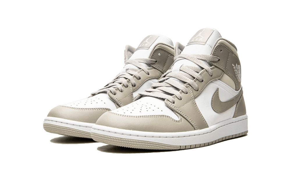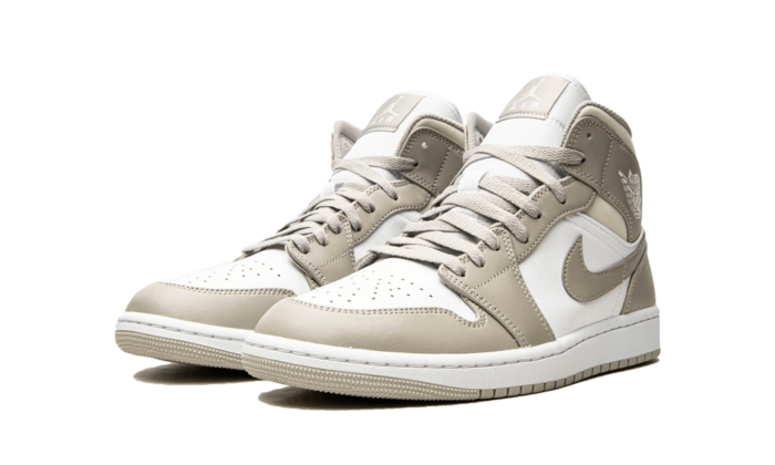 The Air Jordan 1 Mid Linen features the usual white leather upper, highlighted by linen grey inserts on the eyelets and mudguard. Branding features a Jumpman logo and a white Jordan Wings. A white midsole coupled with a gray outsole complete the package.