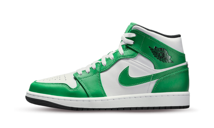 The Air Jordan 1 Mid Lucky Green features a smooth white leather base, accompanied by green leather overlays and black details like the brandings and outsole. A color scheme not unlike that of the Boston Celtics NBA franchise.