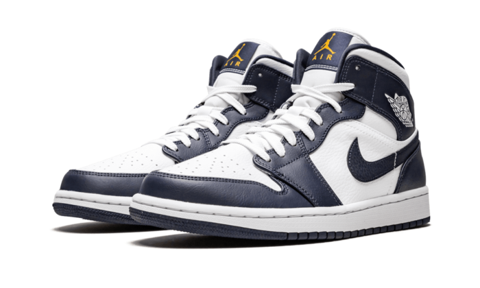 The Air Jordan 1 Mid White Metallic Gold Obsidian features a white leather base with a dark blue, almost black leather overlay. The Wings logo on the ankle is perfectly highlighted in its immaculate color, while the branding on the tongue is in a goldencolor and contrasts with the rest of the pair.
