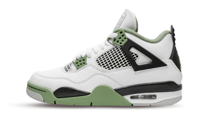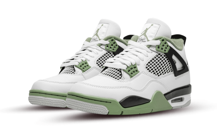 The Air Jordan 4 Seafoam features a white leather upper with black details like the flaps and heeltab. The TPU cage is prominent on the side panel in a white hue. A few touches of light green are sprinkled on the midsole, TPU eyelets, brandings and lining.