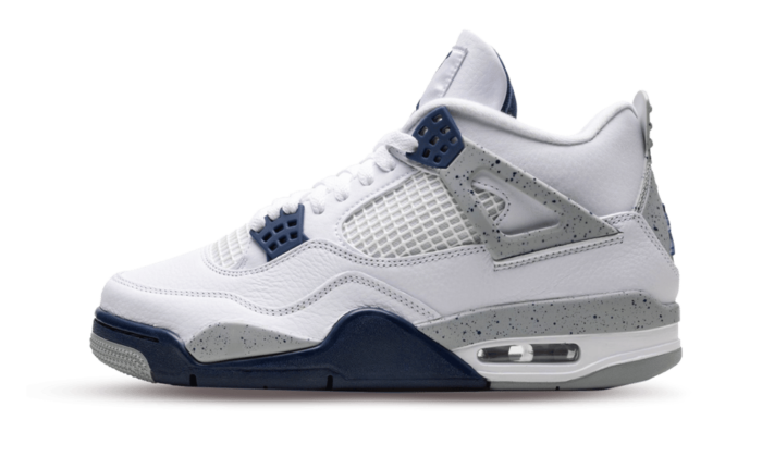The Air Jordan 4 Midnight Navy features a pure white grained leather base. A white mesh insert also resides on the side panel, just behind the iconic TPU cage. For contrast, the creative teams at Jordan Brand teams opted for a navy blue midsole, matched with eyelets, and accompanied by grey reinforcements and flaps sublimated by black droplets.