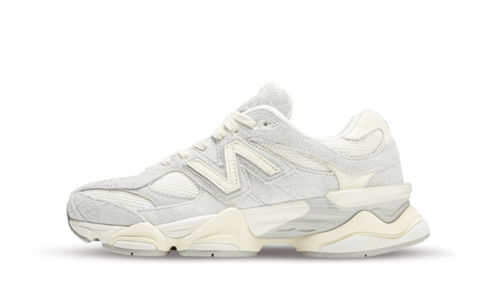 The New Balance 9060 Quartz features an off-white mesh base, accompanied by overlays in gray suede and off-white and gray leather. The centerpiece of this model, the thick sole reinforced with ABZORB and SBS cushioning, reveals the same assortment of colors.