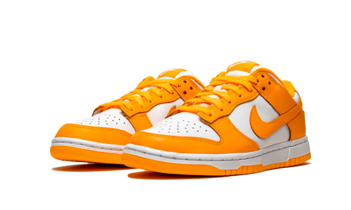 The Nike Dunk Low Laser Orange is adorned with a white leather base, simply enhanced with overlays of a yellow from the central swoosh to the mudguard through the heel and eyelets. Yellow laces, a sole made of rubber and a matching outsole jaune viennent peaufiner la silhouette.