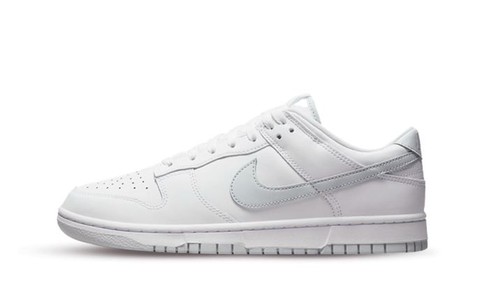 The Nike Dunk Low Retro White Pure Platinum features a white leather base topped with tone-on-tone inserts. Only the side Swoosh and the leather heel tab give a very slight touch of contrast with a light gray shade. To conclude, the sole follows the same pattern with a pristine midsole and a gray outsole.